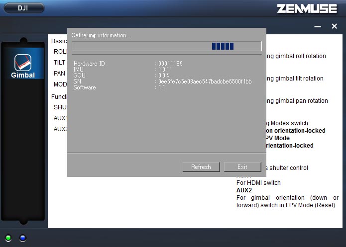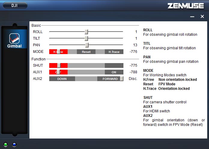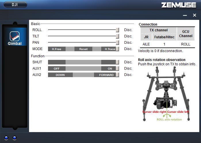 Zenmuse Assisitant のダウンロード DJIのダウンロードページから"Zenmuse Assistant"をダウンロードして コンピューターにインストールします このソフトウエアでは数値を入れる などの設定はありません 操作スティックやスイッチの動作方向の確認 程度です 添付のUSBケーブルをGCUとPCに接続することで確認でき ます シャッターなどのコントロールスイッチチャンネルのエンドポイント、 トラベルアジャストを”赤枠”に合わせます チルト、ロール、パンは送信 機で動作方向を合わせます ”MODE”チャンネルでジンバルの動作方法を選択します 3ポジション SWを使います 中間がFPVモードでカメラは水平または垂直に固定され ます ”H.Trace"でカメラの方位を固定します ”H.Free"では方位は固 定 され ません どちらのモードもPAN、TITL、ROLLともに操作できます |