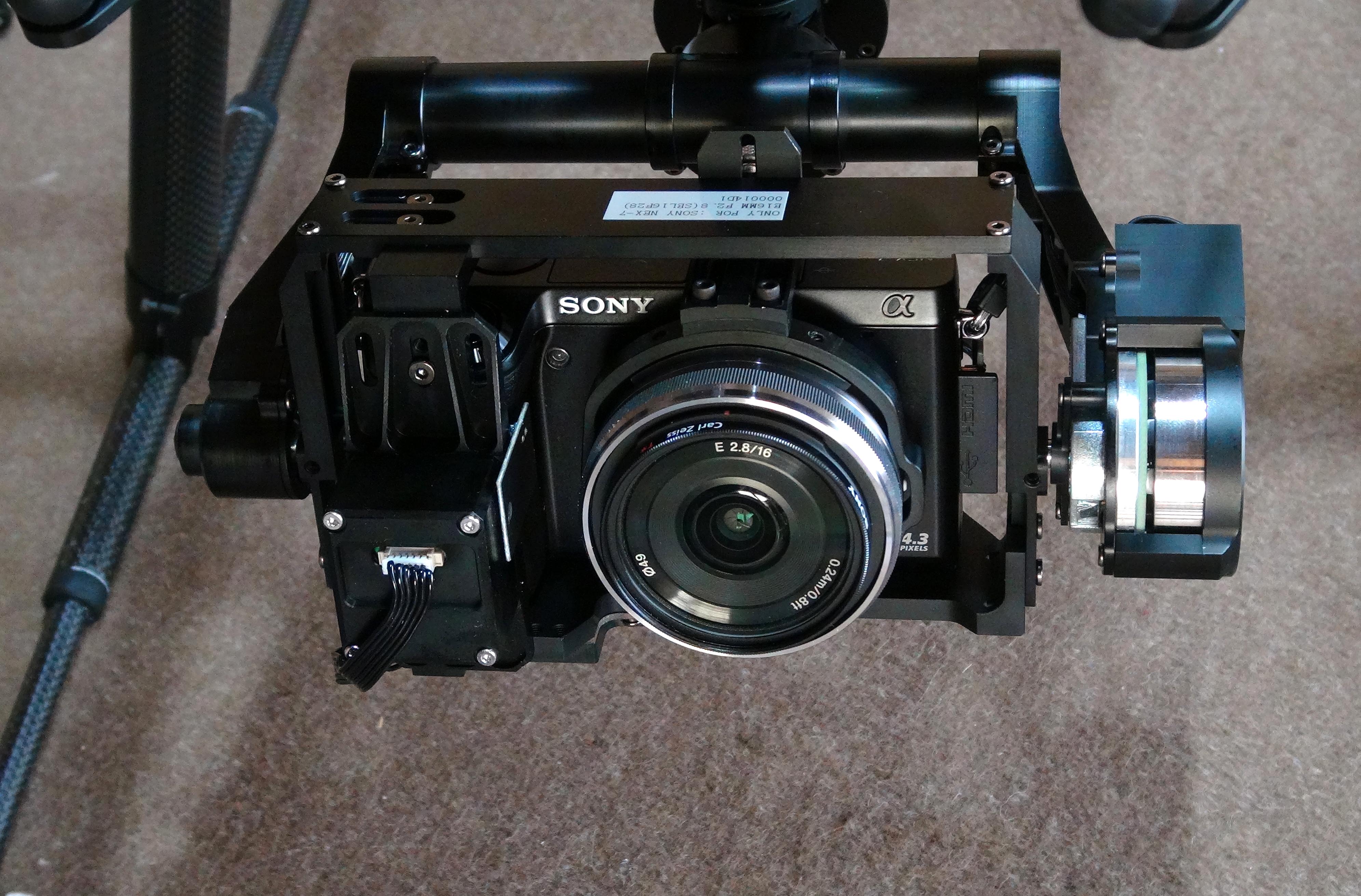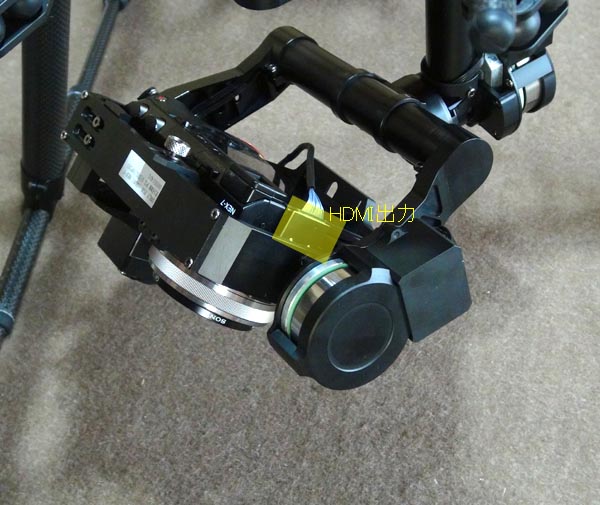 カメラの搭載 全ての準備が完了したら指定のカメラを取り付けます カメラ側のHDMI 出力端子にジンバルからのコネクターを差し込みます これでビデオ出 力とシャッターが可能になります カメラのHDMI出力設定は1080iにして下さい 1080Pなどを設定すると GCUからのビデオ出力が正常にできません |