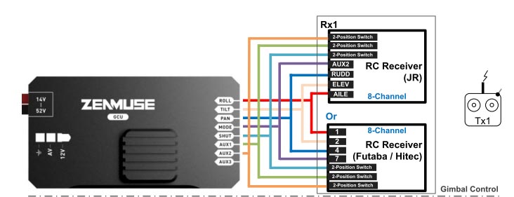 受信機とGCUの接続 ジンバルコントロールのために最大7CHが必要です 受信機とGCUを接 続図を参考にリード線でつなぎます |